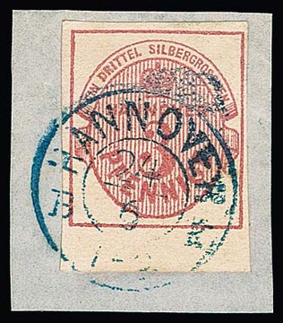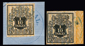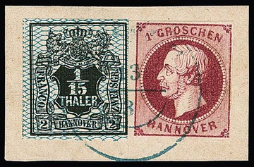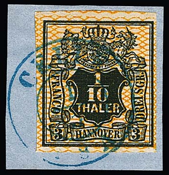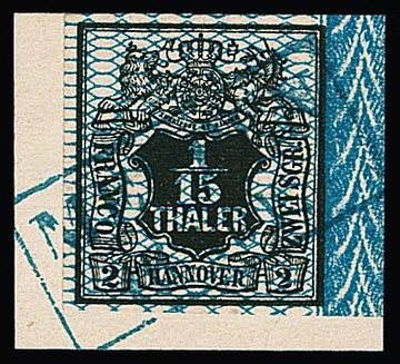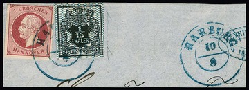 1/15 Th. schw./blau, breit- bis überrandig, auf Luxusbriefstück mit K2 "Hannover", sowie mit Bordüre rechts (Vorfaltspur entlang des Randes) auf Briefstück