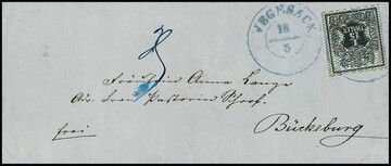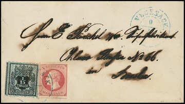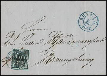 1/15 Th. schw./blau in seltener Mischfrankatur mit 1 Gr. rosa auf gereinigtem Postvereinscouvert mit K2 "Vegesack" nach Breslau. Die Marken voll- bis überrandig, oben im Randbereich gering verblasste Stellen. Seltene Aufbrauchs-Frankatur, Attest Jäschke-L.