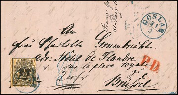 1/10 Th. schw./orange, Plattenfehler in der linken oberen Ecke, teils angeschnitten, als Teilfranko auf Brief 1857 mit K1 "Goslar" nach Brüssel