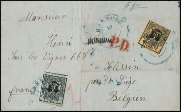 1/15 Th. schw./blau und 1/10 Th. schw./orange, je einseitig berührt bzw. angeschnitten, auf zweifach gefaltetem, voll bezahltem Auslandsbrief (Gebrauchserhaltung) mit K2 "Harburg" 1858 nach Liege/Belgien