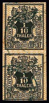 1/10 Th. schw./orange, senkrechtes frisches Kabinettpaar, sowie waager. Paar (eine Marke kl. Mgl.), Mi. 700,-