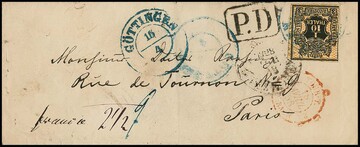 1/10 Th. schw./orange, links angeschnitten, auf teilbar-bezahltem Auslandscouvert von Göttingen 1858 nach Paris, hs. "2 1/2" Sgr. für bar bezahltes Porto, Ra1 "P.D."