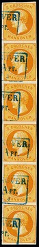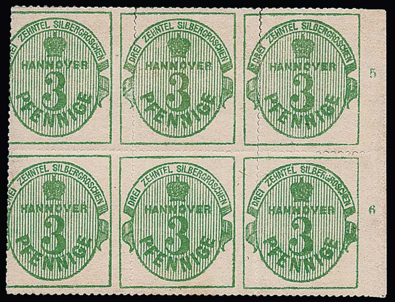 3 Gr. dunkelorange, allseits voll- bis breitrandiger senkrechter Kabinett-Sechserstreifen mit Ra3 von Hannover, lediglich im Rand ausserhalb links minimale helle Stellen und eine leichte Aufklebefalte im Zwischenraum treffen die Marken nicht. Von dieser Nuance sehr seltene Einheit, die anderen großen Einheiten sind praktisch alle von der gelborange 3 Gr., vorliegender Streifen sogar noch mit großen Teilen des Originalgummis. Ex 10. Grobe 1925, 34. Kruschel 1992 (DM 2000,-), sign. Krause, Kruschel, Köhler und Attest Jäschke-L. Mi. für Viererstreifen 600,-