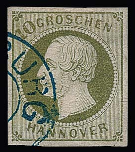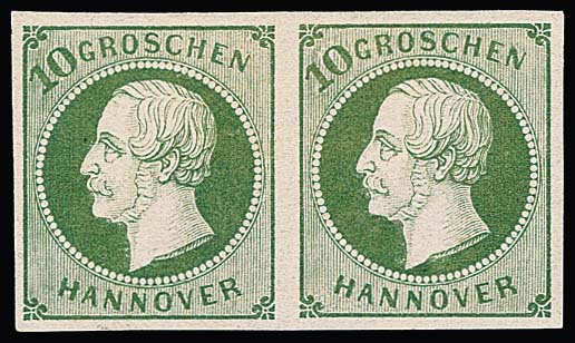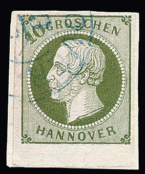 10 Gr. grün, oben voll- sonst teils breitrandig, unten mit Bogenrand (!), leicht gestempelt mit K2 "Hannover", auf kleinem Kabinettbriefstück, sign. Berger. Mi. 1700,-