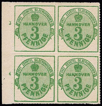 3 Pfge. grün, ungewöhnlich gut zentrierter ungebrauchter Kabinett-Viererblock vom linken Bogenrand mit Reihenzahlen "3" und "4", Mi. 200,- +