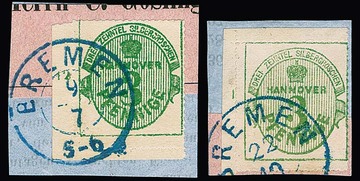 3 Pfge. grün per zwei auf Briefstück mit zentr. K2 von Bremen, sowie einzeln auf Briefstück, und vier lose Exemplare (u.a. Nr. 21z), Mi. 780,-, meist sign. Engel