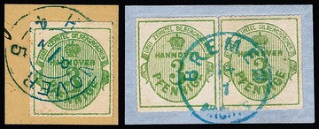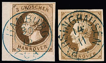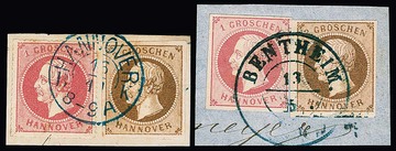 3 Gr. braun, zwei Luxusstücke, zentr. K1 "Barsinghausen" bzw. auf Briefstück mit K2 "Hamburg", sign. Drahn, Grobe u.a.