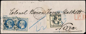 1/2 Gr. schwarz mit linkem Bogenrand und Reihenzahl "2" (mit Plattenfehler "gebrochenes "o" von Groschen", rechts berührt), nebst Kabinettpaar 2 Gr. blau, auf Damencouvert von Hannover nach Nizza, Fotoexp. Berger