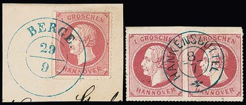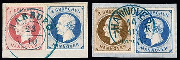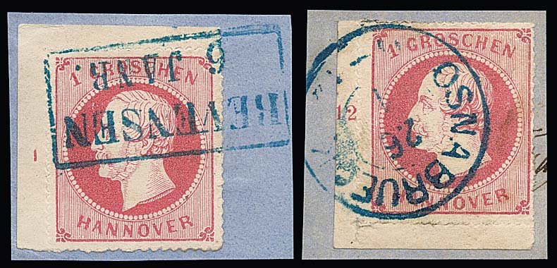 1 Gr. rosa nebst 2 Gr. blau (K2 "Harburg") bzw. 2 Gr. blau nebst 3 Gr. braun (K2 "Hannover Nachts"), auf zwei Kabinettbriefstücken, einmal sign. Engel