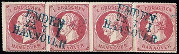 1 Gr. rosa, seltener gestempelter Viererstreifen mit Bahnpost-L3 "Emden-Hannover" (Durchstich etwas gestützt), sign. Bühler, dazu drei gest. Dreierstreifen, u.a. vom Rand mit Rz. "9" bis "11", Mi. 700,- +