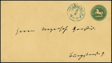 Stadtpost-Ganzsachencouvert 5 Pfg. mit "Pferd-Motiv", als gebrauchtes Pracht-Ortscouvert aus Hannover, sign. Engel. Mi. 600,-