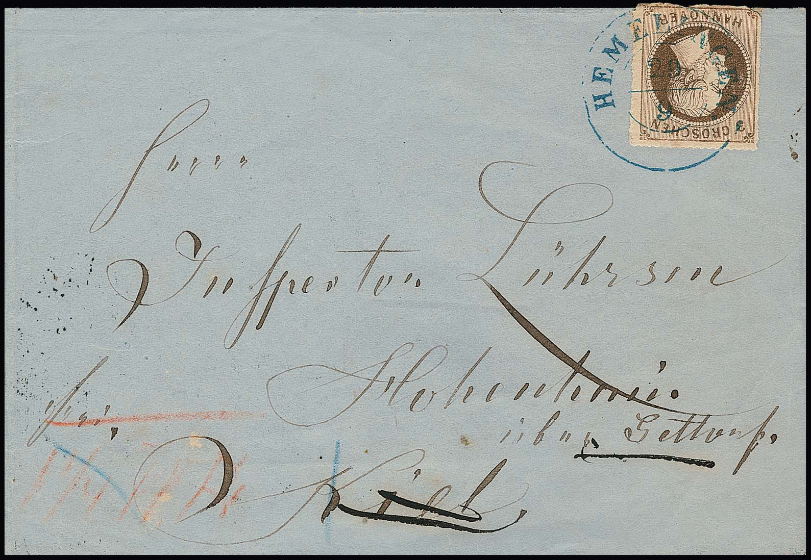 "Hemelingen", blauer K2 auf Faltbrief mit 3 Gr. braun (unten kl. Mgl. durch Randklebung) nach Schleswig-Holstein, erst nach Kiel und dann weitergesandt in den Landbezirk von Gettorf, mit Bartaxe "1" für Weitersendung, rs. fünf Stempel