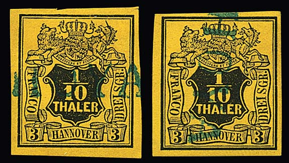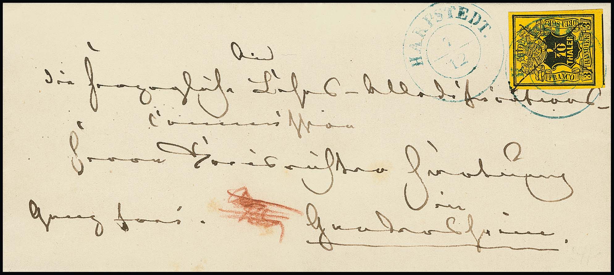 "Harpstedt", K2 auf zwei Kabinettbriefen 1 Ggr. bzw. 1/10 Th. schw./gelb (diese zusätzlich typisches Federkreuz, nach Gandersheim), sowie ideal zentr. auf Briefvs. mit Luxusstück 1/30 Th.
