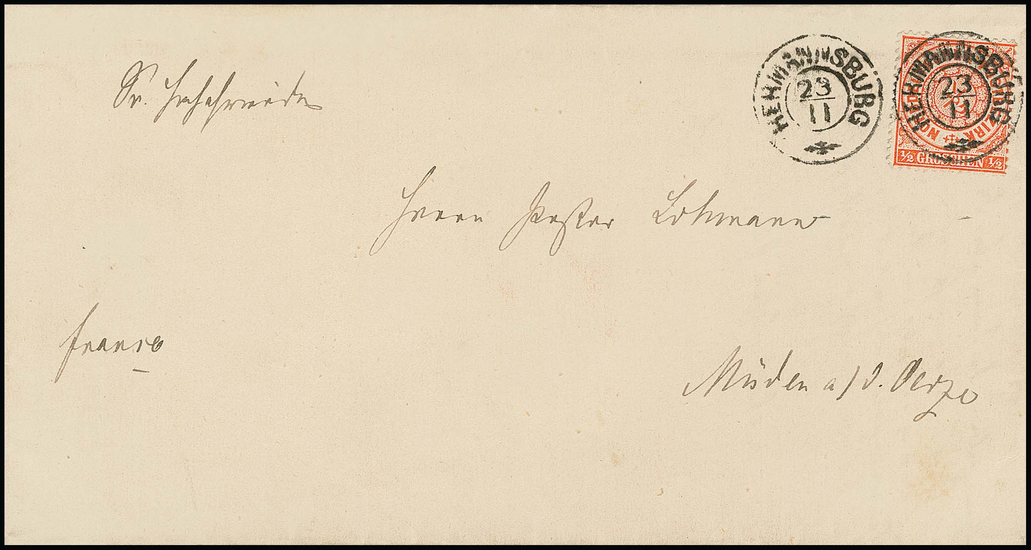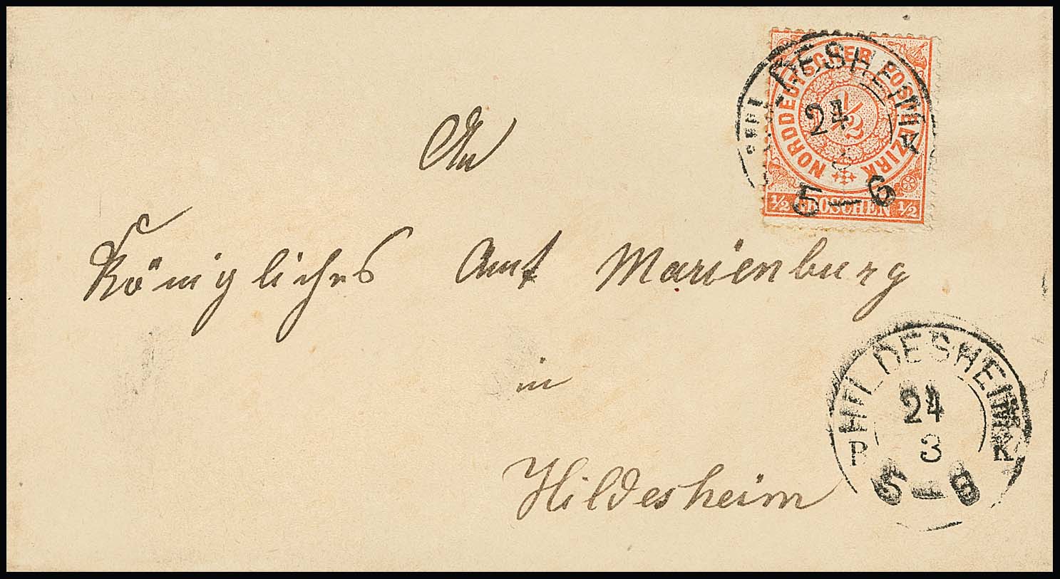 "Hildesheim", nachverw. K2 klar auf Pracht-Ortsbereichs-Briefchen mit Einzelfrankatur NDP 1/2 Gr., aus dem eigenen Landbezirk stammend von der Gemeinde Itzum (rs. Stempel)