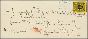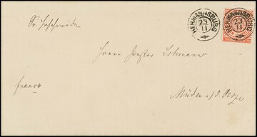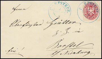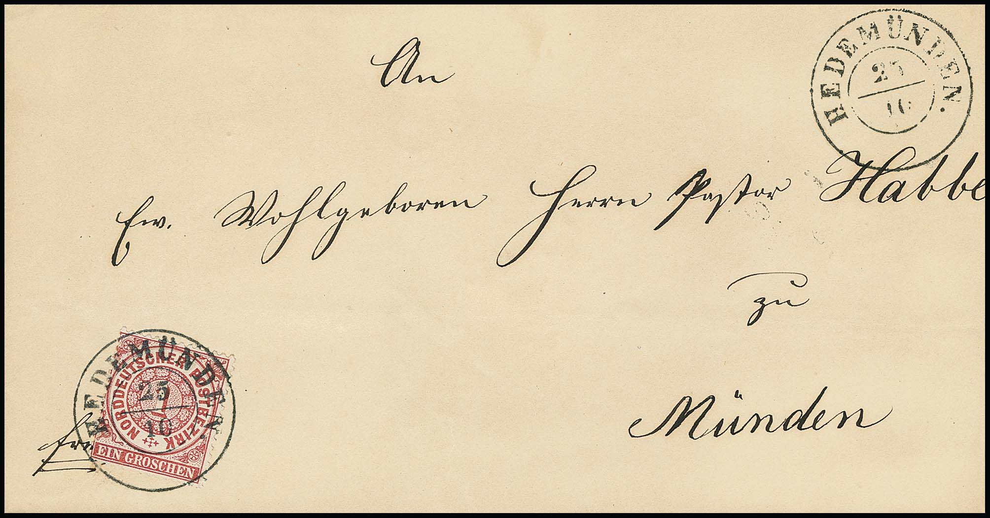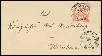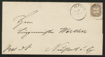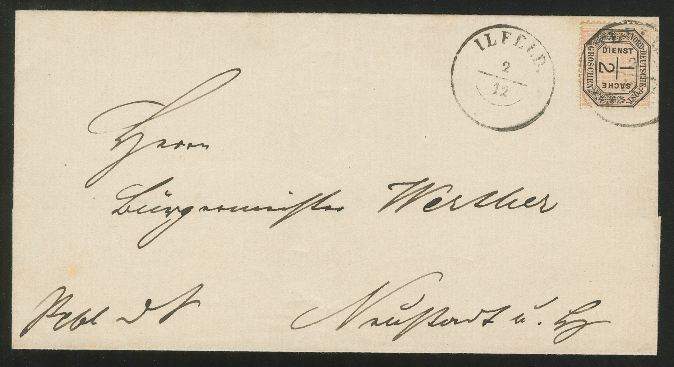 "Ilfeld", nachverw. K2 auf Brief mit Einzelfrankatur NDP Dienst 1/2 Gr., innerhalb des eigenen Landbezirks gelaufen von Hohnstein (rs. Gemeindestempel) nach Neustadt a.H., beide im Landbezirk von Ilfeld