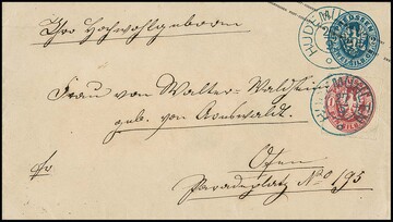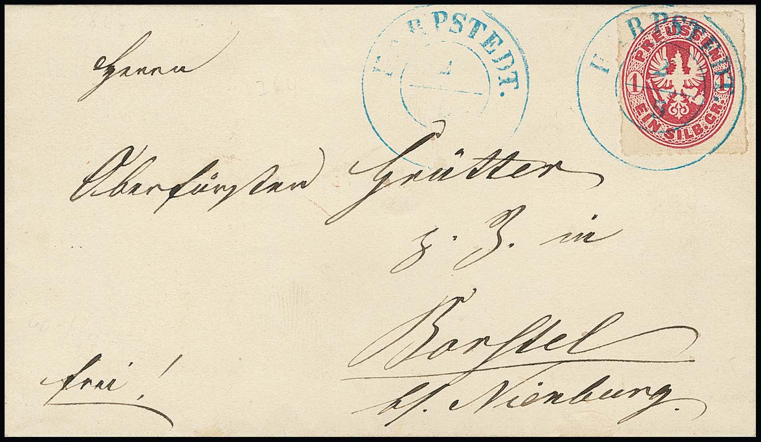 "Hudemühlen", sehr klarer und seltener nachverw. blauer K2 auf dekorativer Preußen-Ganzsache 2 Sgr. preußischblau, mit ZuF 1 Sgr. (kl. Eckknitter) nach Ofen in Ungarn. Dopp. sign. Kruschel mit hs. Zusatz "einzigartig"