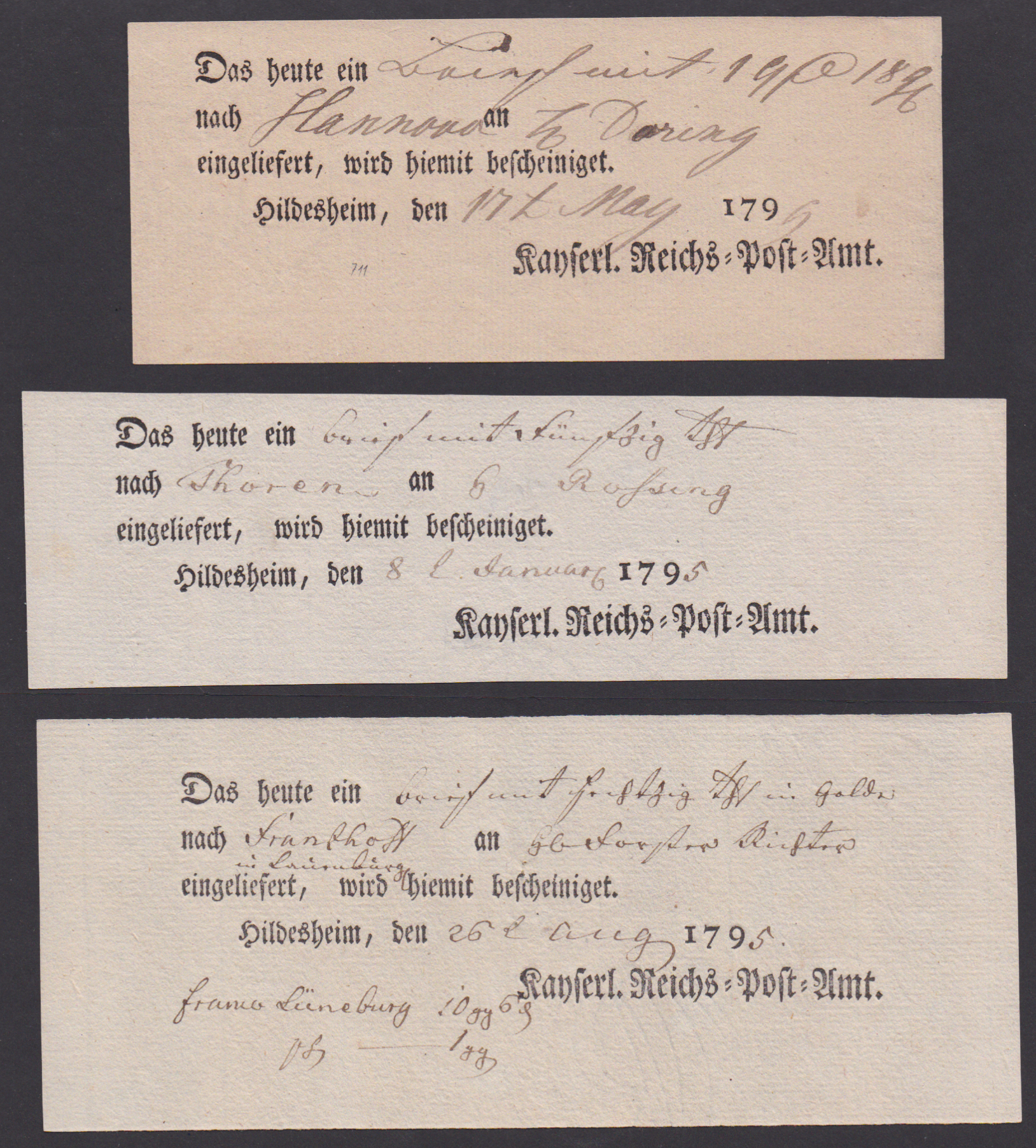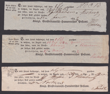 "Hildesheim", 1815-1832, drei Ortsdruck-Postscheine, Hb. 12a, 13