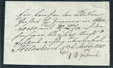 "Hildesheim", 1770, "K.R. Postamt", hs. Post-Einlieferungsschein für einen Wertbrief mit 10 Louisdor nach Hannover