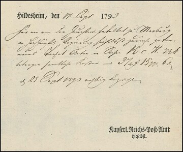 "Hildesheim", 1793, Reichspost-Vordruck als hs. Quittung für ein Retour-Paket (Kosten hierfür enorme 37 Rth., 15 Ggr., 6 Pfge.)