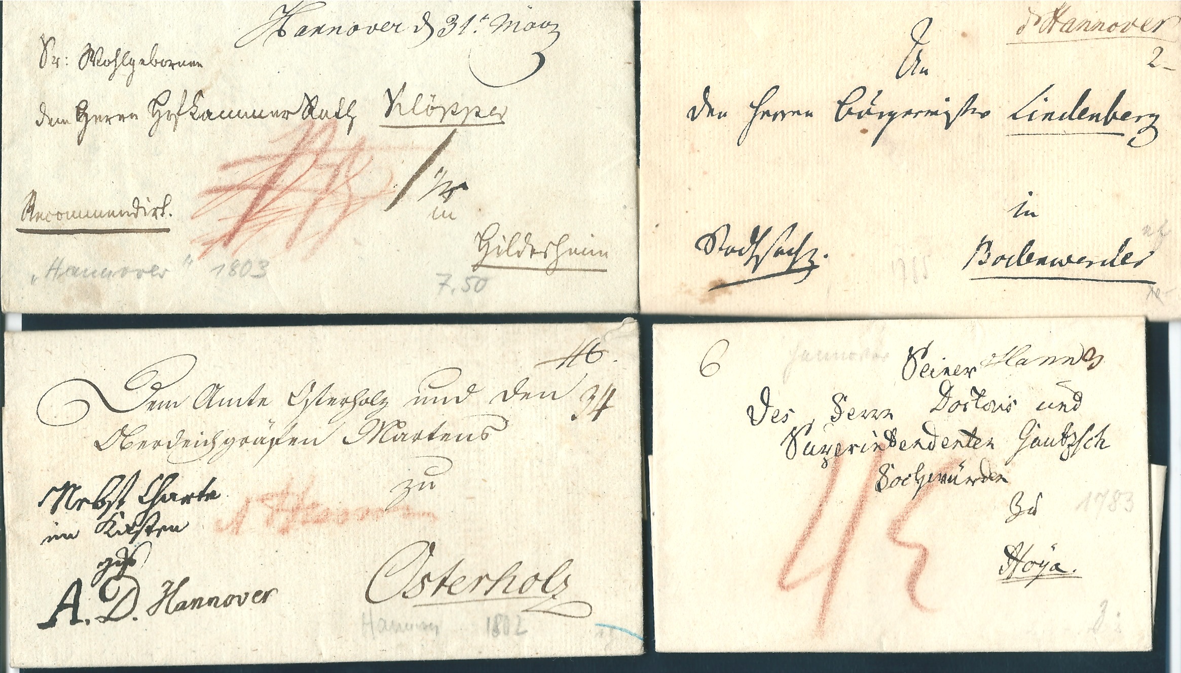 "Hannover", 1783-1806, neun Briefe mit handschriftlichen Aufgaben (viele versch. Varianten)