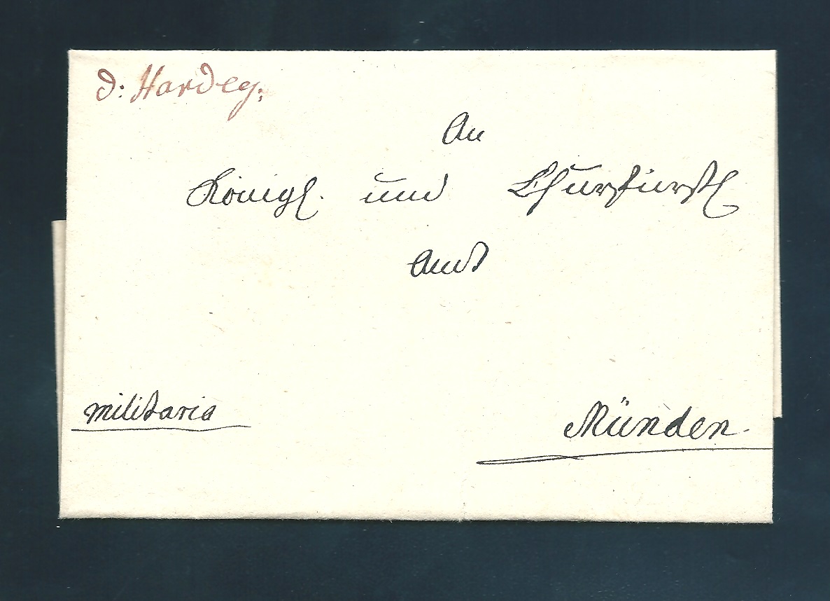 "Hardegsen", (1790), rote Tintenaufgabe "d` Hardeg." auf sauberem Brief (kl. Randriß)