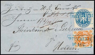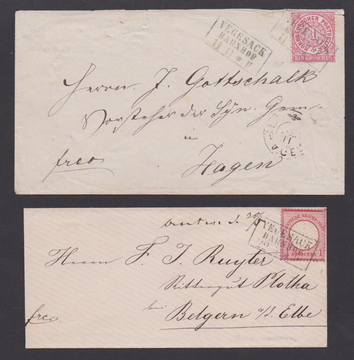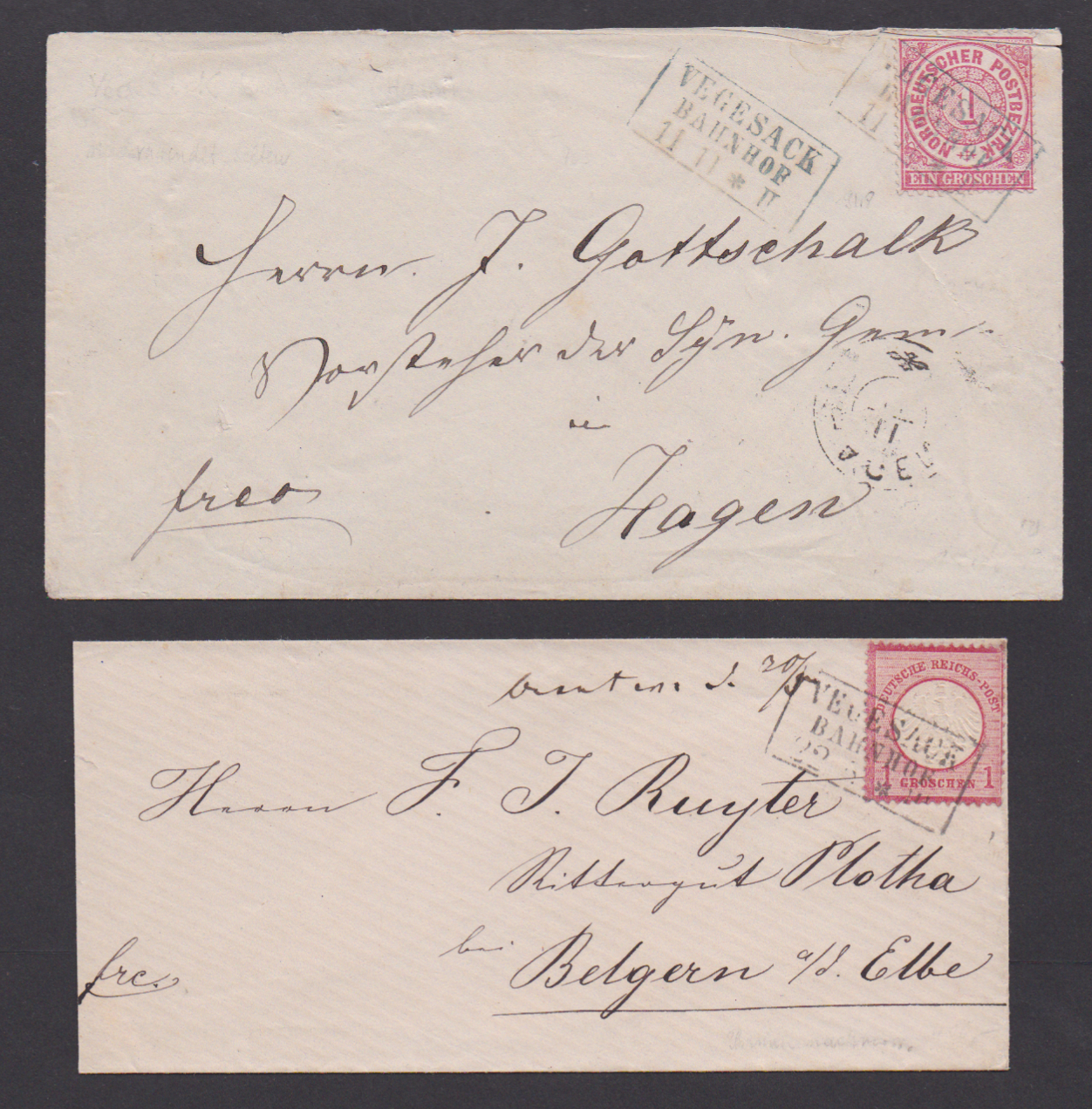 "Vegesack Bahnhof", seltener Ra3 nachverwendet in blau (Hb. nicht gelistet) auf Brief NDP 1 Gr. karminrosa (Randfehler), sowie in schwarz auf Couvert mit 1 Gr. kl. Brustschild
