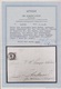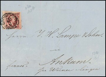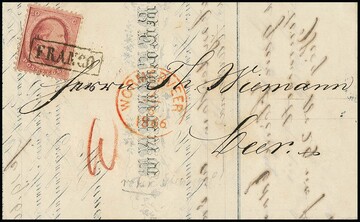 Nahbereichsporto Holland-Hannover: Kabinettstück Niederlande 10 C. rot vom linken Bogenrand (Pl. IV, Feld 81) auf Faltbrief (unten in der Faltung ausserhalb gering fleckig) von Groningen nach Ankum/Ostfriesland 1857, Porto Niederlande 5 C. plus erster Rayon Hannover 5 C. = 10 C. Attest Dr. Louis