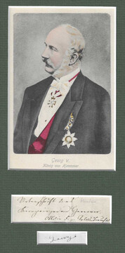 Ernst-August I. (1771-1851), König von Hannover (ab 1837), sowie Georg V. von Hannover (1819-1878), letzter König von Hannover, je eigenhändige Unterschriften auf Abschnitten (dekorativ mit Foto zu je einer Ausstellungsseite angelegt)