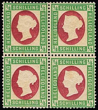 1/4 Sch. grün/karmin, der Fehldruck im ungebrauchten Viererblock, rechte untere Marke makellos postfrisch, die drei anderen Falz, davon das linke Paar gering getönte Stellen im Gummi! Seltene Einheit, Attest Müller