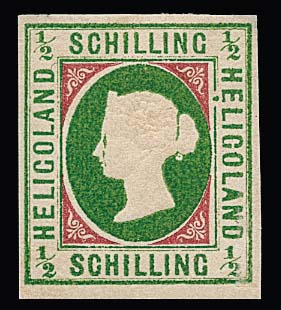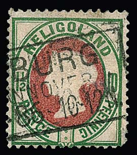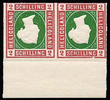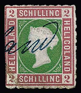2 Sch. lilakarmin/grün, Mängel (u.a. Scherentrennung links) mit seltener handschriftlicher Entwertung "(Helgo)land"