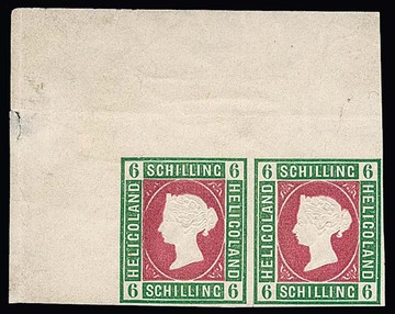 6 Sch. grün/rosa, Berliner Neudruck II von 1879 (Urdruck) im geschnittenen postfrischen Paar aus der linken oberen Bogenecke (Rand Haftspuren)