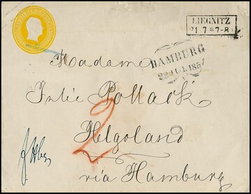Incoming-Mail, 1857, Preußen-Kopf-Ganzsache 3 Sgr. orangegelb im Großformat (oben leichte Gebrauchs- und Faltspuren) als Teilfranko-Couvert mit Ra2 "Liegnitz", "fr. Hgb.", nach Helgoland, dort restliches Porto von "2" Sch. nacherhoben, vs. Transit-Schmetterlingsstempel von Hamburg