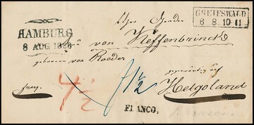 Incoming-Mail, 1860, sauberer Faltbrief mit Ra2 "Greifswald" via "Hamburg" (vs. Schmetterlingsstempel) nach Helgoland, Taxe "4 1/2" mit 3 Sgr. Postverein und "1 1/2" Sgr. Weiterfranko