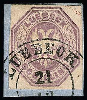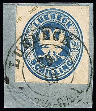 Ganzsachen-Ausschnitt 2 1/2 Sch. blau, breitrandig viereckig und tadellos, auf Briefstück (dieses etwas hinterklebt) mit K2 "Lübeck", von größter Seltenheit, es sind nur ganz wenige Ausschnitte bekannt! Ex Gaston Nehrlich, Attest Brettl. Mi. 1800,-