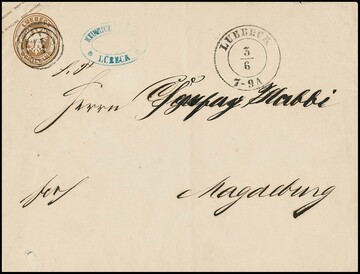 Ganzsache 4 Sch. braun im seltenen Großformat mit Dreiringstempel "L" und K2 "Luebeck" nach Magdeburg gelaufen. Für ein Großformat unvermeidliche Bugspur und kleiner Aktenspieß (Adresse überschrieben), dennoch ein frisches und seltenes Couvert. Mi. 2000,-