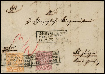 2 Kr. orange und 3 Kr. karmin (gezähnt), Prachtstücke mit Ra3 "Homberg a.d. Ohm" auf Bestellgeldbrief (min. fleckig) nach Flensungen (Grünberg)