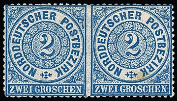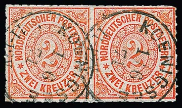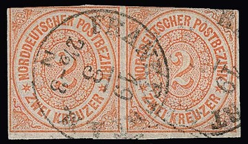 2 Kr. orange, waagerechtes Paar, mittig und unten kein Durchstich, oben angeschnitten (siehe Foto), mit K1 "Frankfurt", typisch für die erste Lieferung, sign. Bühler, Stock