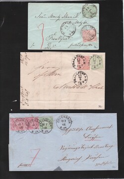 1 Kr. grün (durchstochen bzw. gez.) je nebst 2 Kr. orange auf zwei Briefen aus Darmstadt bzw. Frankfurt. Dazu 1 Kr. grün und zweimal 3 Kr. karmin auf Brief aus Offenbach