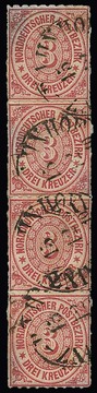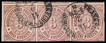 3 Kr. rosa, waagerechter Dreierstreifen ohne Durchstich aus der Erstlieferung mit hierauf typischem K1 von Frankfurt, unten gering berührt, oben deutlich überrandig
