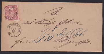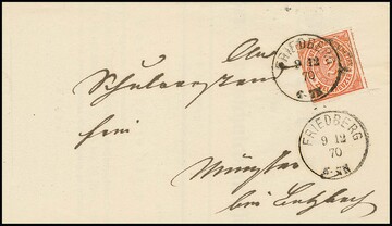 2 Kr. orange (unten aufgrund des unzureichenden Durchstichs etwas unruhig getrennt) als ungewöhnliche Einzelfrankatur auf Landpost-Drucksache von Friedberg (K1) 1870 nach Münster bei Butzbach (1 + 1 Kr.)