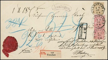 18 Kr. ockerbraun in Mischfrankatur mit zwei gezähnten 3 Kr. rosa auf "Auslagen"-Paketbegleitbrief-Adresse (Vorläufer der Paketkarte) mit K1 "Darmstadt" nach Glauchau, Kabinett