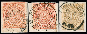 2 Kr. orange (Taxis-K1 "Dettingen" und "Gross-Gerau"), sowie 18 Kr. ockerbraun (K1 "Sigmaringen"), drei Kabinettbriefstücke, zwei sign. Engel bzw. Starauschek
