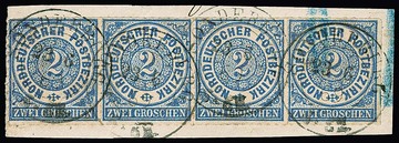 2 Gr. blau im Viererstreifen auf Prachtbriefstück mit Schleswig-Holstein-K2 "Sonderburg" (und rechts Blaustrich)