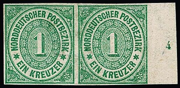 1 Kr. grün, ohne Durchstich, im ungebrauchten Paar vom rechten Bogenrand mit Reihenzahl "4", leichter Gummibug