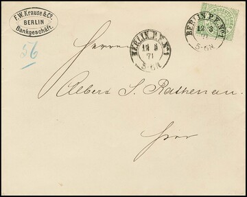 1/3 Gr. grün, perfektes Exemplar auf innen und aussen besonders dekorativ in rotbraun gedruckter Drucksache des Minerva-Kunst-Vereins mit Ra3 "Berlin Post-Exp. 5 Potsdam. Bahnh."