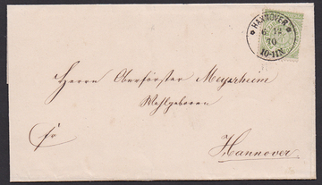 1/3 Gr. grün (ein kurzer Zahn) als Einzelfrankatur auf sauberem Ortsbrief aus Hannover 1870
