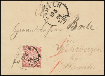 1/2 Gr. orange einzeln auf Prachtbrief 1871 mit K1 "Hameln" in den eigenen Landbezirk nach Wehrbergen