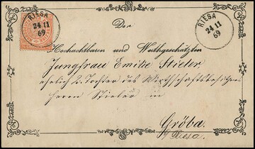1/2 Gr. orange (zwei kurze Zähnchen) einzeln auf vorder- und inseitig reichhaltig bedrucktem Taufpaten-Zierbrief mit K1 "Riesa" 1869 in den eigenen Landbezirk nach Gröba