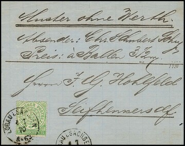 1/3 Gr. gelbgrün (etwas "eckrund") in seltener Verwendung auf "Muster-ohne-Werth"-Streifband (!) von Löbau