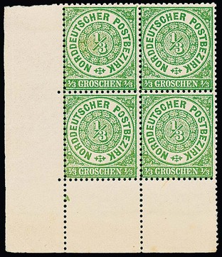 1/3 Gr. grün im postfrischen Viererblock (Falzrest nur links oben im Aussenrand) aus der linken unteren Bogenecke mit Plattenkennzeichen "A", sign. Spalink